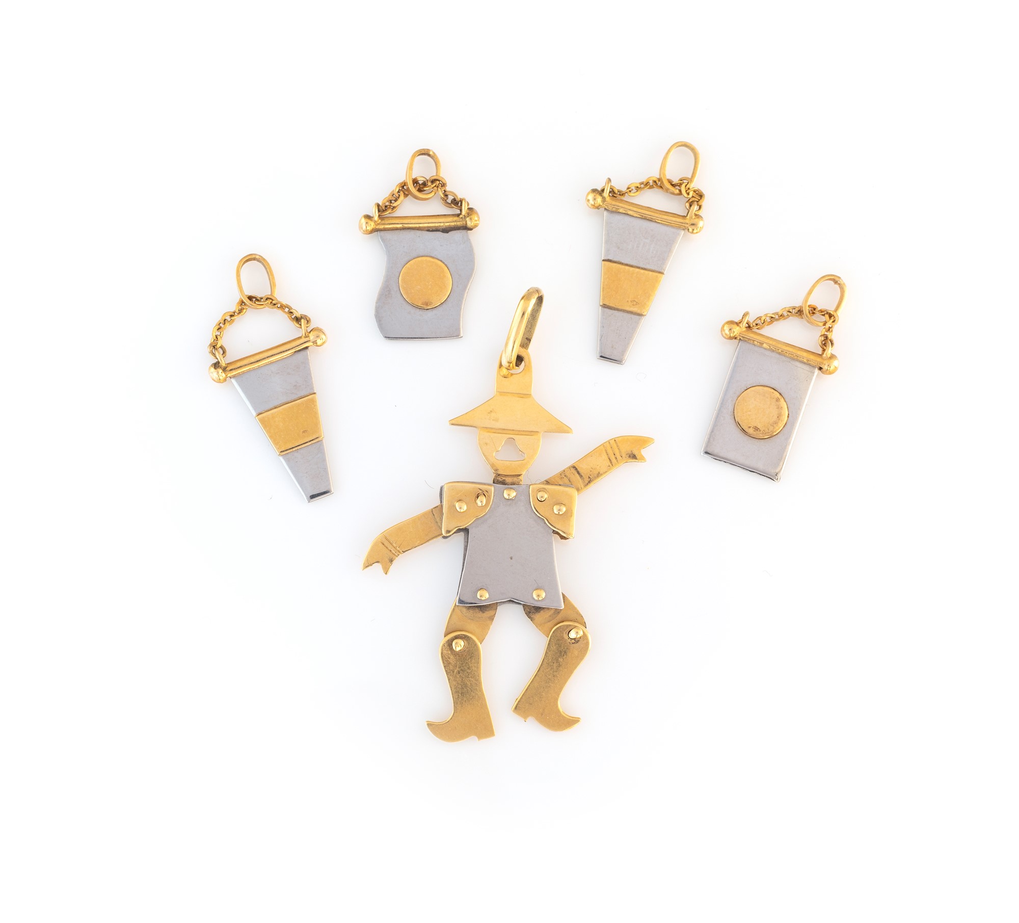 Lotto di quattro ciondoli bandiera e pupazzo in acciaio e oro