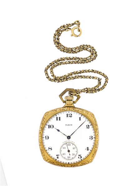 ELGIN Orologio da tasca metallo, con catena in oro 9K Epoca inizio secolo XX Qu