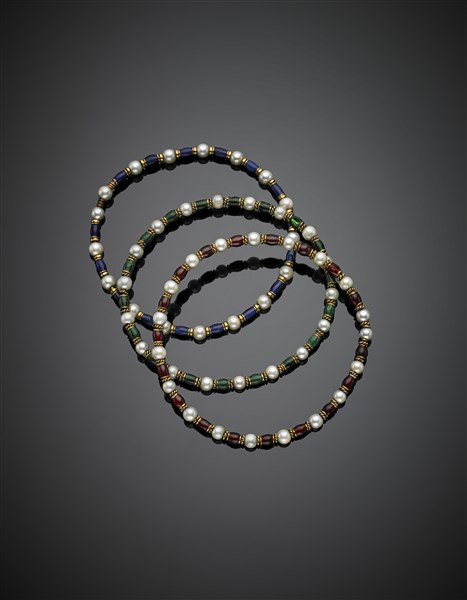 Tre bracciali rigidi in oro giallo con smalti e perle, complessivi g 35,70 circ