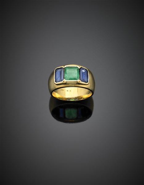 Step cut ct. 1 circa emerald and two sapphire in all ct. 1.20 circa yellow gold band ring, g 9.30 circa size 12/52. Marked 831 AL. (slight defects)