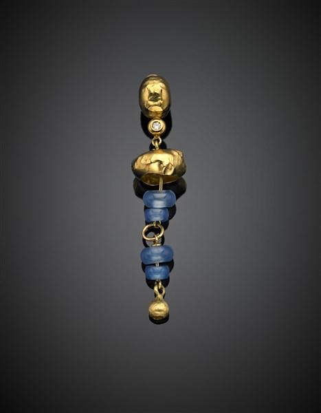 Mono orecchino in oro giallo, calcedonio azzurro e un diamante, g 5,25 circa, lungh. cm 6 circa.