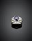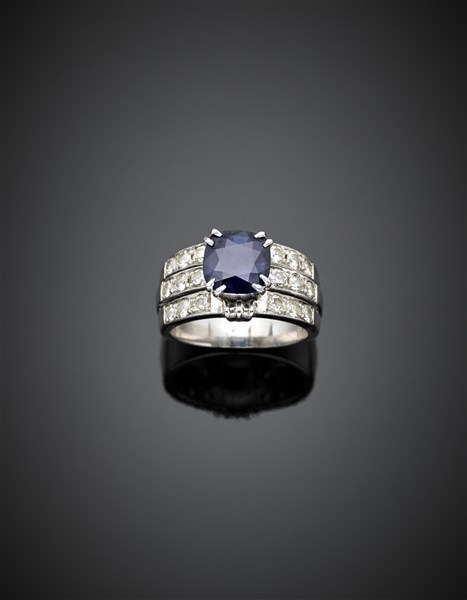 Anello in oro bianco, rifinito con tre file di diamanti per complessivi ct. 0,50 circa e uno zaffiro centrale di ct. 3 circa, g 7,90 circa misura 13/53. Firmato Mars MI.