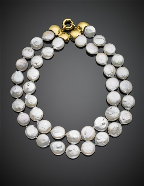 Collier a due fili di perle grigie lenticolari d'acqua dolce, chiusura in oro giallo, g 125,30 circa, lungh. cm 41 circa. Firmato e marcato 971 MI.