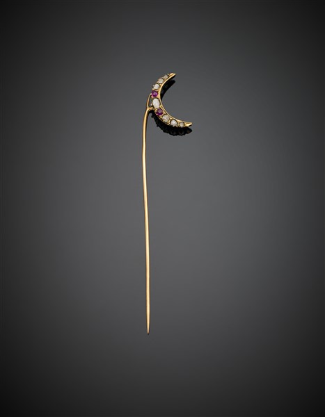 Pin a falce di luna in oro giallo, diamanti a mezza rosetta e rubini g 1,84 circa, lungh. cm 7,70 circa.