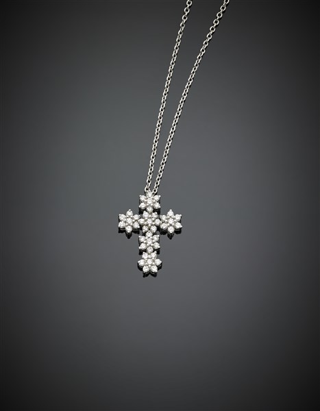 Catena in oro bianco con croce in diamanti per complessivi ct. 0,60 circa, g 5,