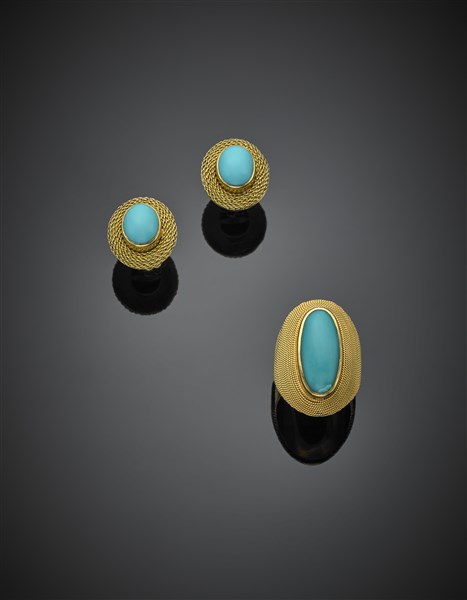 Yellow gold blue neolite lot comprising ring size 12.50/52.50 and cm 1.50 earrings, in all g 16.70 circa.