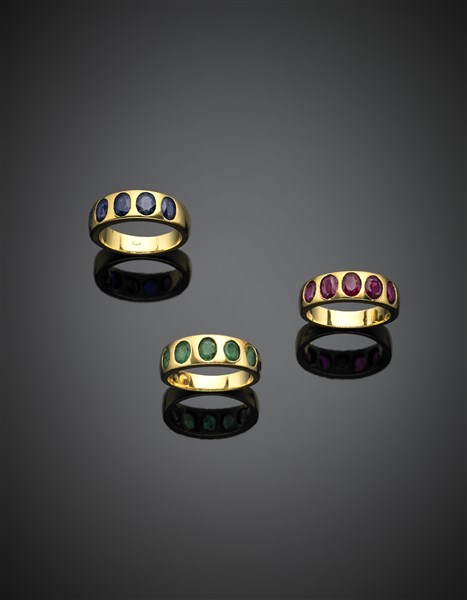 Lotto di tre fedi in oro giallo con rubini, smeraldi e zaffiri ovali, complessi