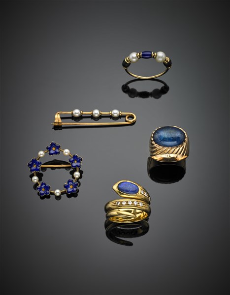 Yellow gold lot comprising two pins of cm 2.50 and 3.70 circa and three rings accented with pearls, diamonds enamel and various gems, rings size from 9/49 to 13/53, in all g 24.50 circa.