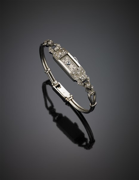 Orologio da polso da donna in oro bianco e diamanti con bracciale semirigido, g 20,80 circa, diam. cm 5,90 circa. Quadrante firmato Orfina Swiss, FP sulla cassa. (mancanze)