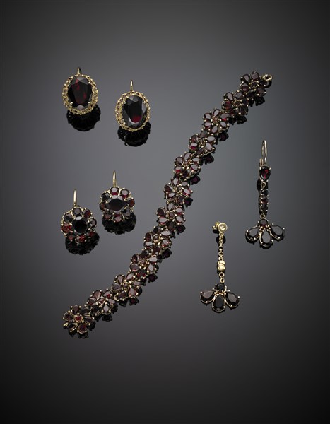 Lotto in oro giallo 585/1000 e granati composto da tre paia di orecchini, di cui uno con lievi differenze e rifinito con piccolo diamante, bracciale di cm 17.20 circa con maglia per allungare, complessivi g 70,20 circa.
