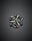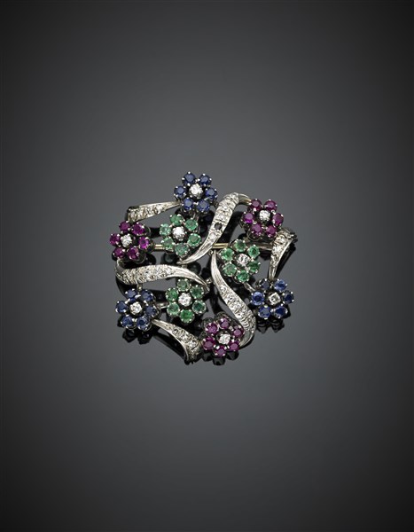 Spilla floreale in oro bianco, diamanti, smeraldi, zaffiri e rubini, g 12 circa, diam. cm 3,50 circa. (mancanze)