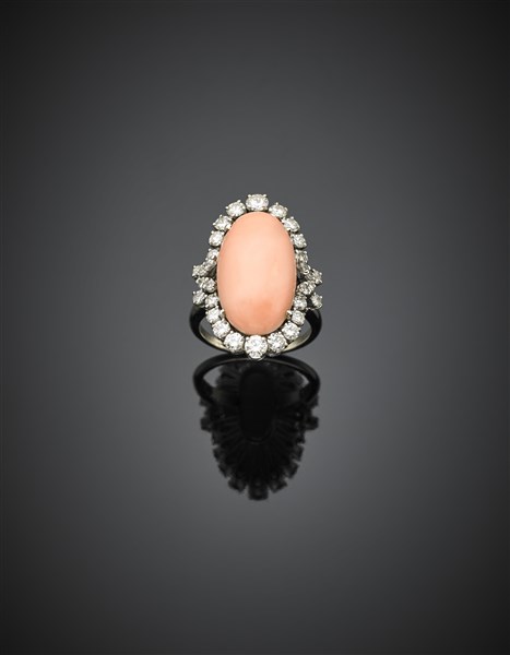 Anello in oro bianco con corallo rosa ovale di mm 20.50x11.50 circa e diamanti rotondi per complessivi ct. 1,60 circa, g 9,00 circa misura 13/53.