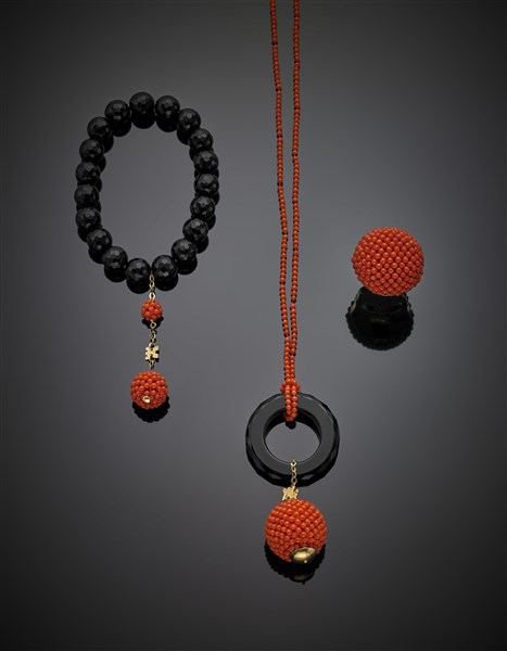 Red coral, onyx and and yellow gold jewellery set comprising long cm 84 circa necklace with cm 6.70 circa pendant , elastic bracelet diam. cm 6.20 circa and ring size 16/56, in all g 59.50 circa. Signed and marked Rajola, 1054 NA.