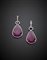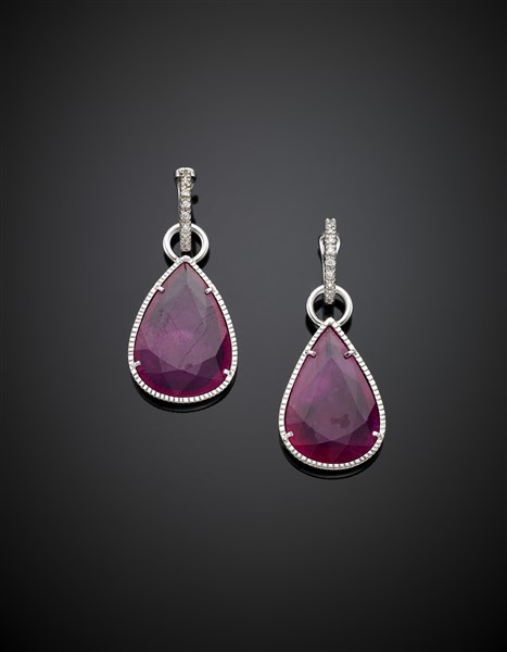 Pear shape red corundum white gold pendant earrings accented with diamonds, g 13.10 circa, length cm 4.20 circa. Marked 3589 AL.