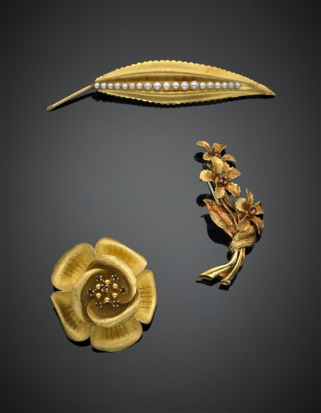 Lot 630 | Lotto in oro giallo e rosso composto da tre broches floreali rifinite con perle