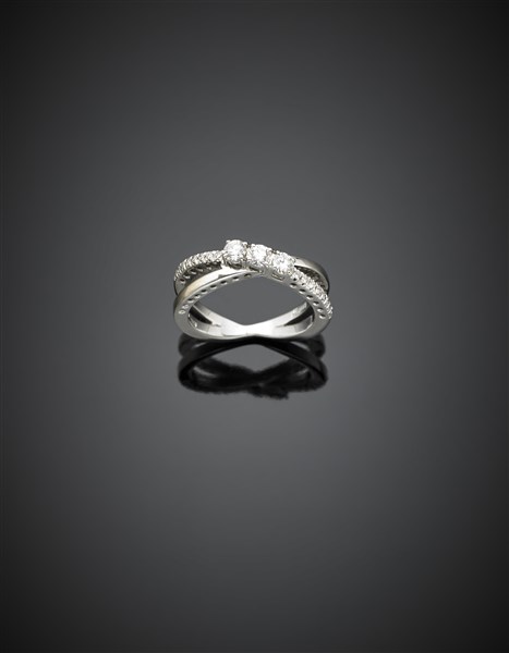 Anello in oro bianco a due fedine incrociate, rifinito con diamanti per complessivi ct. 0,50 circa, g 6,60 circa misura 15/55. Firmato e marcato Leo Pizzo, 2041 AL.