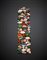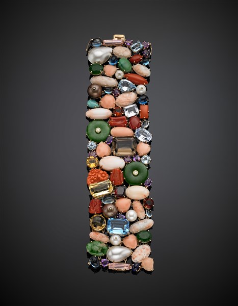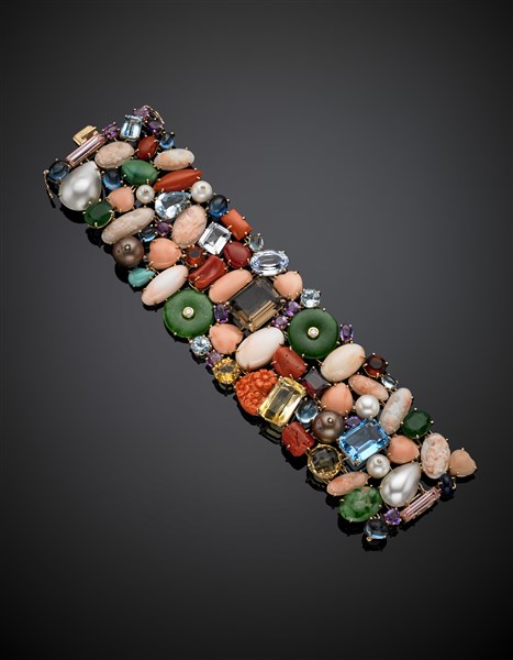 Variously cut gem, coral and synthetic gem pink 14K gold band bracelet, g 99 circa, length cm 18.80, width cm 5 circa.