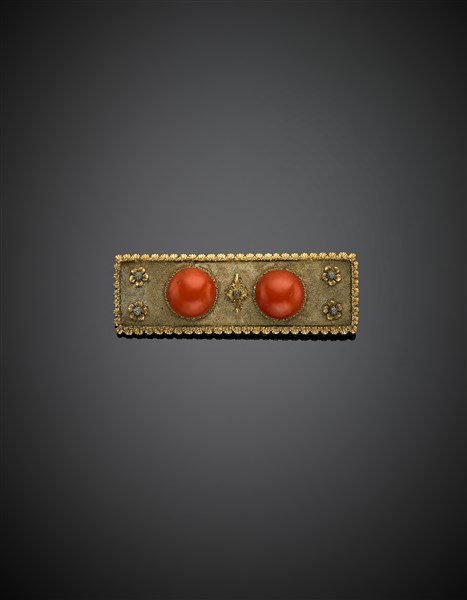 Broche in oro giallo e argento con due coralli arancioni rossastri rotondi e cabochon, g 20,20 circa, lungh. cm 6 circa.