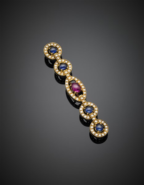 Spilla a barretta in oro giallo ad ovali e cerchi rifinita con zaffiri e rubino cabochon contornati da diamanti, g 8,70 circa, lungh. cm 6,20 circa. Firmato e marcato Corbetta, 730 MI.
