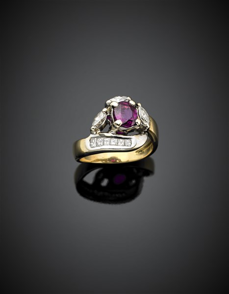 Bi-coloured gold oval ct. 1 circa ruby ring accented with diamonds in all ct. 0.50 circa, g 8.90 circa size 18/58. In original "Gioielleria Montagna case and appended Guarantee Certificate of 21/06/1997