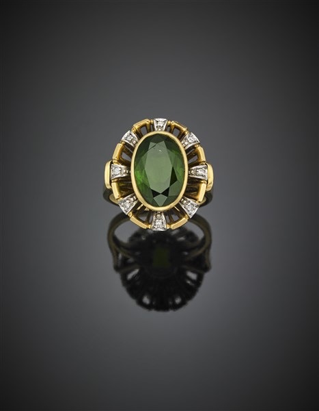 Anello in oro giallo e bianco rifinito con diamanti e tormalina verde ovale centrale di ct. 4,20 circa, g 7,90 circa misura 12,50/52,50.