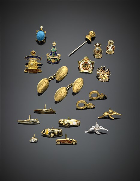 Bi-coloured gold, enamel and diamond lot comprising eighteen lapel pins with metal stops (one missing) and a pair of cufflinks with VR initials, in all net g 48.60 circa. Some signed Scarabeo. (defects)