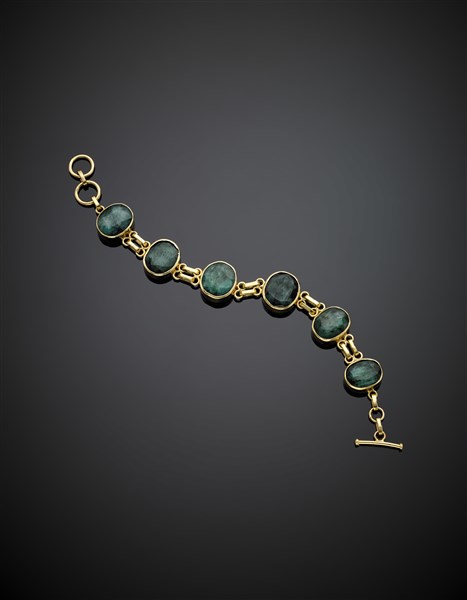 Bracciale in oro giallo con gemme verdi ovali, g 39,40 circa, lungh. cm 19,80 circa.