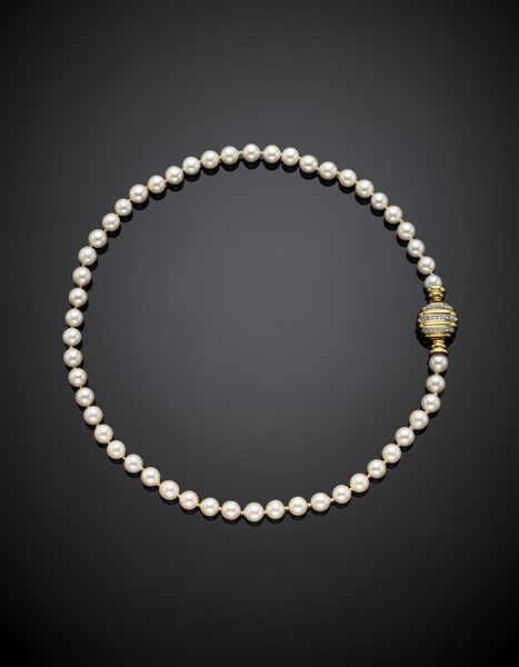 White mm 6.50/7 cultured pearl necklace with yellow gold diamond clasp, g 31.40 circa, length cm 43.30 circa.