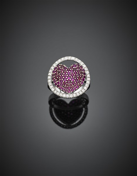 Anello in oro bianco, rifinito con diamanti e rubini a formare un cuore, g 6,20 circa misura 15/55. Marcato 2297 MI.