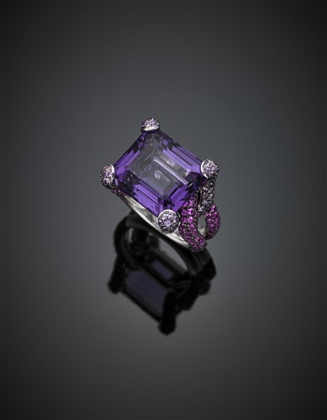 Anello in oro bianco con ametista rettangolare di ct. 17,50 circa, il gambo e le griffe rifiniti con corindoni sintetici, g 17,50 circa misura 18/58. In scatola "Gioielli di Via della Spiga"