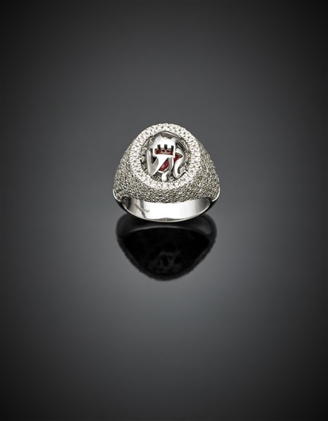 Lot 695 | DI GREGORIO Anello chevalière in oro bianco rifinito con diamanti per complessi