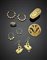 Lotto in oro giallo composto da broche/pendente rotonda decorata a grottesche, quattro anelli con perle, gemme sintetiche e rubini e due paia di orecchini con perle, complessivi g 55,60 circa. (lievi difetti)