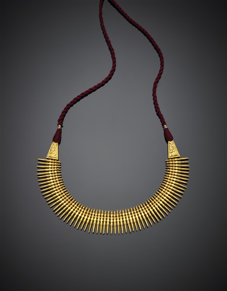 Collier etnico in oro giallo rifinito con un cordoncino, lordi g 27,50 circa. (lievi difetti)