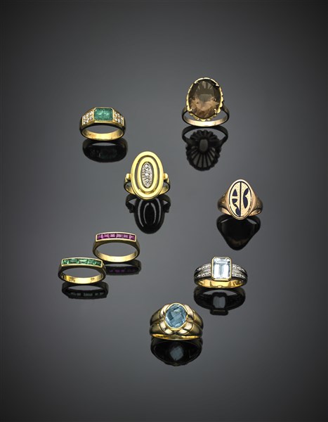 Lotto in oro giallo e bianco composto da otto anelli con diamanti, smeraldi, ge