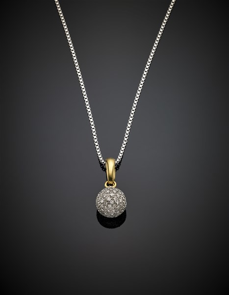 Bi-coloured gold and diamond pavé cm 2.70 circa globe pendant with white gold chain, in all ct. 1.50 circa, g 13 circa, length cm 40 circa. Chain marked 335 AR, pendant 2098 AL. Appended original Guarantee by Gioielleria Pelati