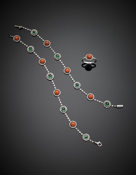 Lotto composto da due bracciali e un anello tutto in oro bianco con diamanti, smeraldi e coralli cabochon. I due bracciali lungh. cm 18,50 e lungh. cm 20 circa, anello misura 14/54, complessivi g 23,15 circa.