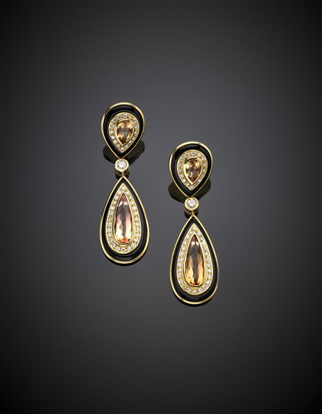 Pear shape topaz, diamond and black enamel yellow gold pendant earrings, g 20.70 circa, length cm 5.30 circa. (losses)