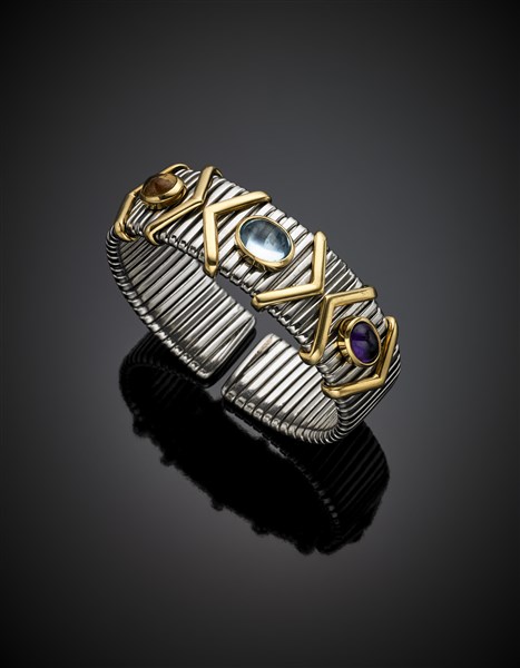 Steel and gold cuff bracelet accented with cabochon stones, gross g 68 circa, diam. cm 6.30 circa.