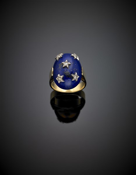 Cabochon lapis yellow gold ring with small white gold diamond stars, g 11.70 circa size 14/54.