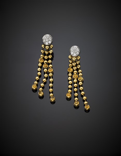 *Orecchini pendenti a nappe in oro giallo, diamanti e zaffiri gialli, g 15,40 c