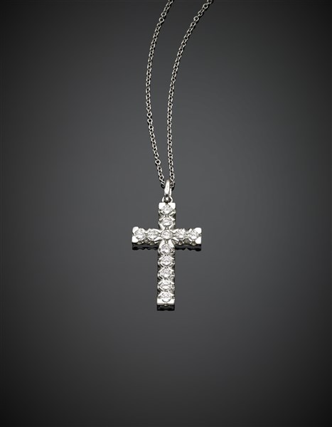 Catenina in oro bianco con croce pendente rifinita con diamanti per complessivi ct. 1,40 circa, g 5,60 circa, lungh. cm 41 circa.