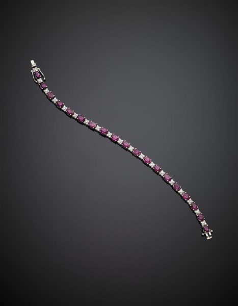 Bracciale in oro bianco con rubini ovali per complessivi ct. 9 circa e diamanti per complessivi ct. 1 circa, g 13,80 circa, lungh. cm 18,80 circa.