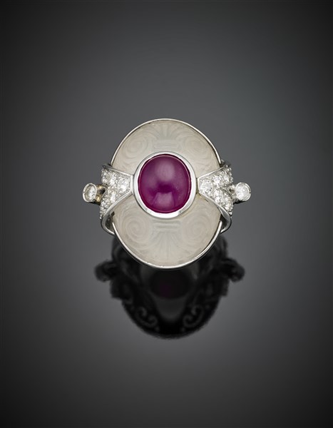 Carved hyaline quartz, diamond and mm 11 x 10 circa cabochon ruby white gold ring, diamonds in all ct. 0.90 circa, g 17.40 circa size 16.50/56.50.