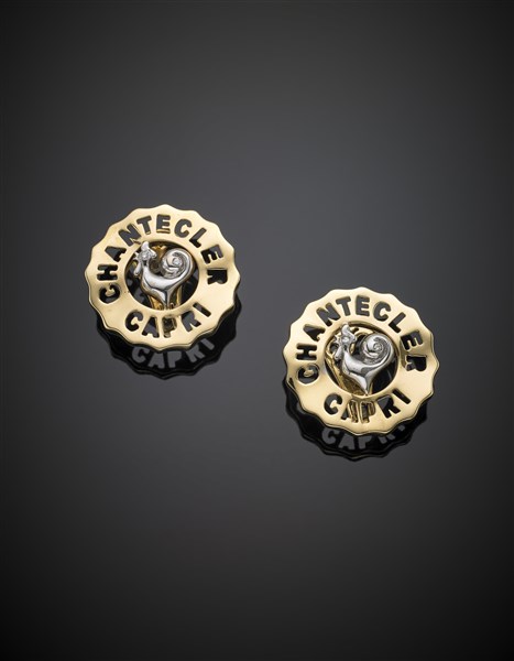 Bi-coloured gold diamond accented earclips, g 21.20 circa, diam. cm 3 circa. Signed, marked and with logo Chantecler Capri, 1059 NA.