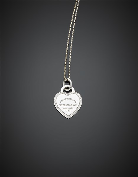 Pendente a guisa di cuore in oro bianco con diamanti marcato Tiffany & co, catena non di competenza in oro bianco marcata 288 AR, g 9,30 circa, lungh. cm 46,50 circa.