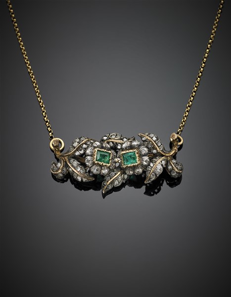 Emerald and diamond silver and gold central with yellow gold chain, g 12.70 circa, length cm 44.70 circa. The chain marked 13 VI. In Federico Buccellati case