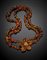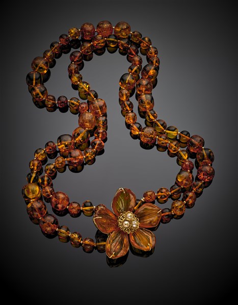 Collana lunga a due fili di boules d'ambra da mm 11.80 a mm 19 circa con distanziatori in oro giallo, rifinita con centrale a fiore in ambra e oro di cm 7 circa, perle e diamanti come pistilli, lungh. cm 62 circa g 218 circa. Il centrale firmato e marcato Giodoro, Zerilli, 1485 MI. (difetti)