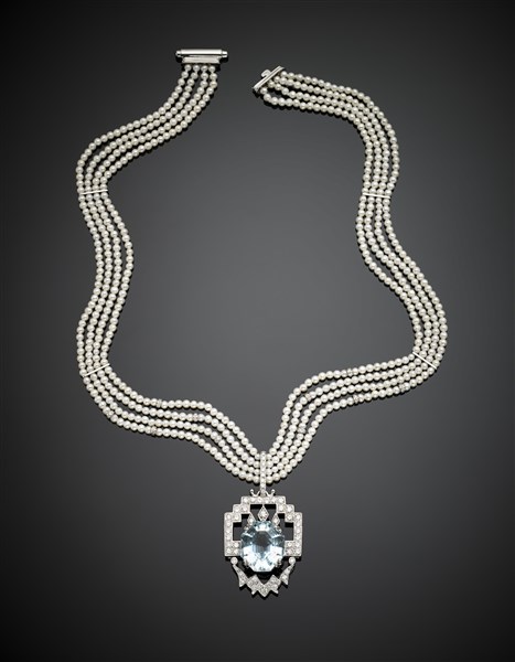Collier a quattro fili di perle coltivate intervallate da distanziatori in oro bianco, centrale pendente snodato in oro bianco e diamanti per complessivi ct. 1,30 circa l' acquamarina centrale di ct. 23 circa, g 44,40 circa, lungh. cm 44 circa. Marcato 1557 AL.