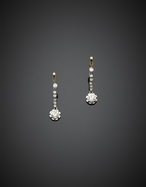Two round ct. 0.65 circa each diamond yellow gold and platinum pendant earrings, in all ct. 1.60 circa, g 4.80 circa, length cm 2.50 circa. French marks for gold and platinum.