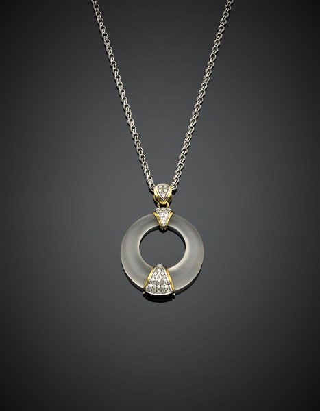 White gold chain with hyaline quartz hoop pendant accented with bi-coloured gold and diamonds in all ct. 0.60 circa, g 24.50 circa, length cm 42.50 circa. Chain signed 1 AR, Unoaerre. (slight defects)